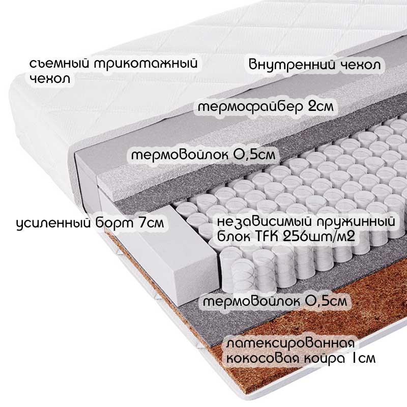 8 Латексированная кокосовая койра (1см) Кокосовая койра - 100% натуральный материал с уникальными свойствами. Койра, скрепленная натуральным латексом, дает объемную упругую воздухопроницаемую структуру. Такой материал используется в моделях, предназначенных для любителей более жесткого и упругого спального места. Естественные вентиляционные качества, эластичность, прочность, упругость, гигиеничность и антиаллергенность, наряду с очень долгим сроком службы, делают этот материал идеальным для наполнения матраса. |