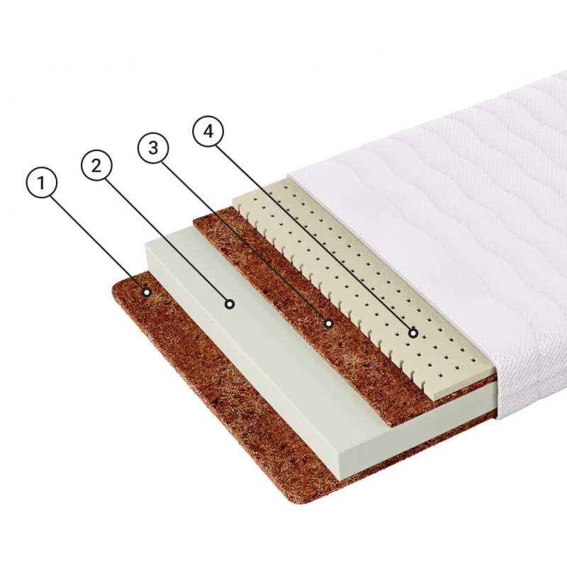 1 Латексированная кокосовая койра (2см) Кокосовая койра - 100% натуральный материал с уникальными свойствами. Койра, скрепленная натуральным латексом, дает объемную упругую воздухопроницаемую структуру. Такой материал используется в моделях, предназначенных для любителей более жесткого и упругого спального места. Естественные вентиляционные качества, эластичность, прочность, упругость, гигиеничность и антиаллергенность, наряду с очень долгим сроком службы, делают этот материал идеальным для наполнения матраса. |